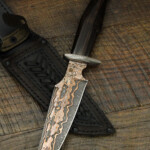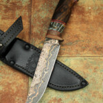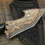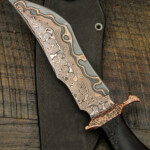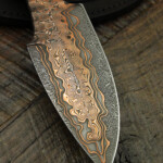Just in time for Blade Show we completed a few knives with a brand new steel. What you’re seeing is our proprietary in-house High Carbon Vanadium Damascus but with Mokume-style layers of copper and nickel. This is a new process for us that took months and months of trial and error to formulate. Just a few knives with this steel have been made so far but we’re looking to expand the process and build more.